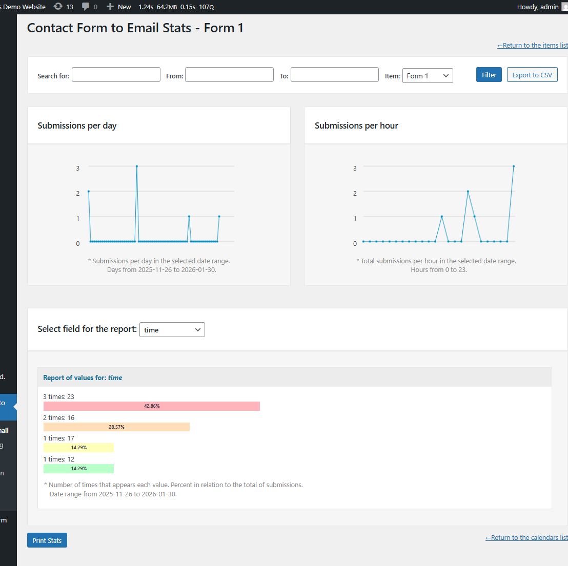 Report of values for a selected field: Select any of the contact form fields and other information fields (like date, IP address, hours) to get a report of how many times each value have been entered or selected. This is very useful if you form is used as a poll to get feedback from users, it makes easy to generate a report on selectable contact form fields. This report can be used also to study the most common data entered in the contact form and get a better idea of your customer’s profile and needs.