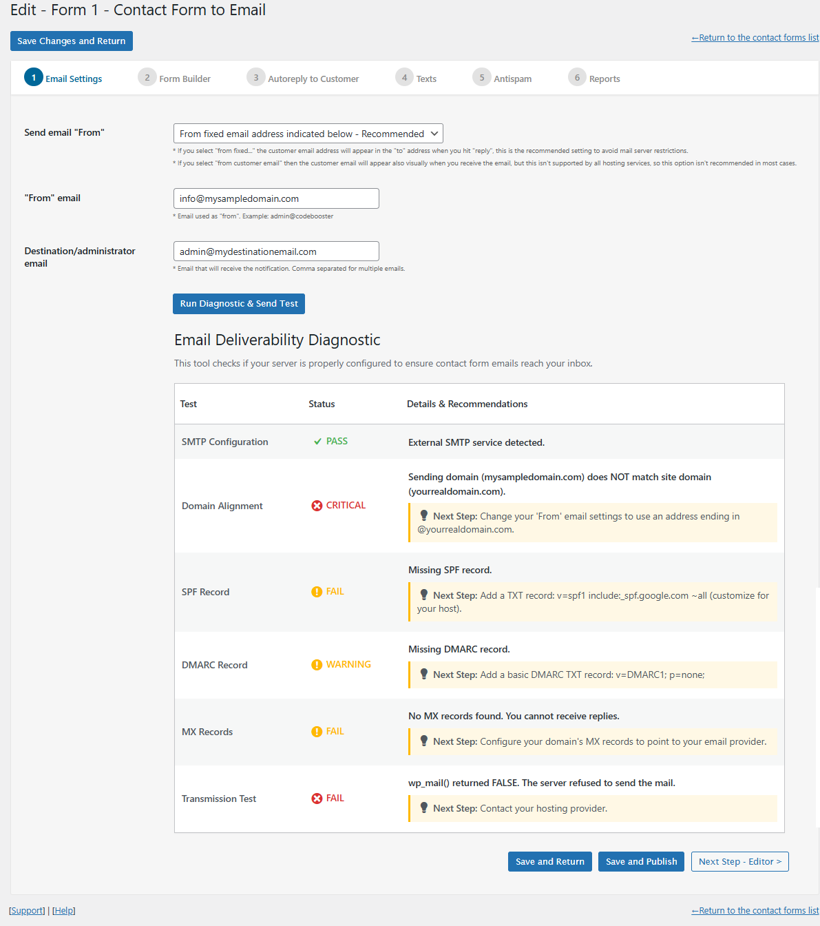 - Email format?: Format of the email that will be sent with the Contact Form to Email reports. Can be HTML or Plain Text. In most cases plain text is easier to setup and has less problems with anti-spam services.